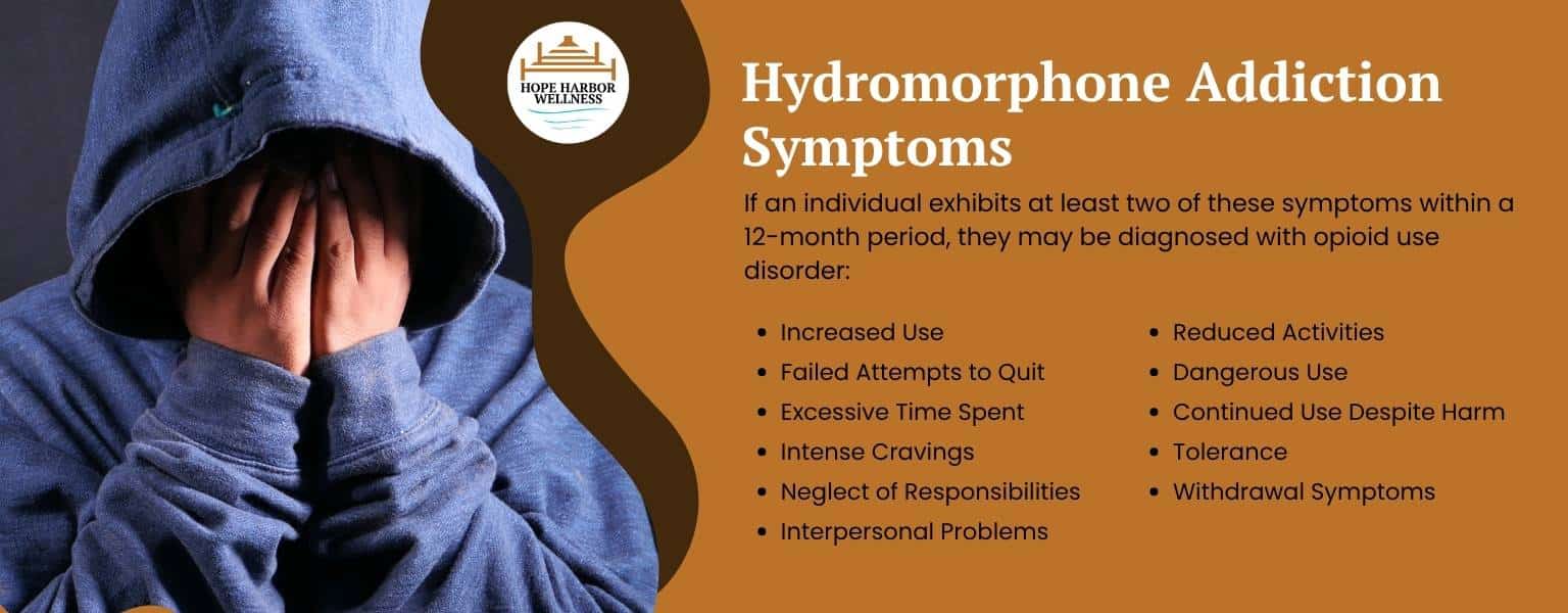 Hydromorphone addiction is clinically described as Opioid Use Disorder. Mental health professionals utilize the DSM-5-TR (the fifth revised edition of the Diagnostic and Statistical Manual of Mental Disorders) to diagnose hydromorphone addiction based on a set of criteria. If an individual exhibits at least two of these symptoms within a 12-month period, they may be diagnosed with opioid use disorder: